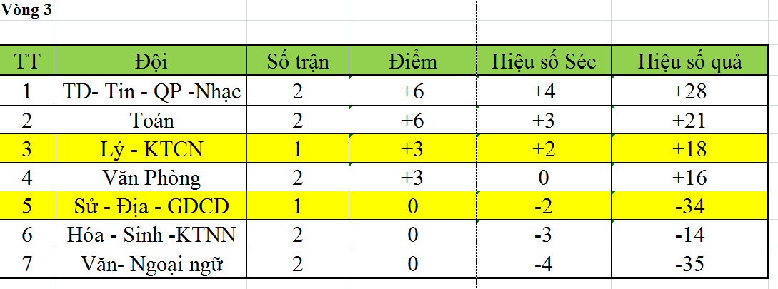 Sau 2 vòng đấu, cuộc đua tại giải bóng chuyền hơi giữa các tổ chuyên môn đang diễn ra đầy gay cấn. Tổ TD-Tin-QP- Âm nhạc hiện dẫn đầu bảng xếp hạng với 6 điểm, nhỉnh hơn tổ Toán (cùng 6 điểm) nhờ hiệu số thi đấu vượt trội. Trong khi đó, tổ Lý-KTCN xếp ở vị trí thứ 3 do thi đấu ít hơn một trận, nhưng vẫn giữ nguyên cơ hội bứt phá trong các vòng sau.