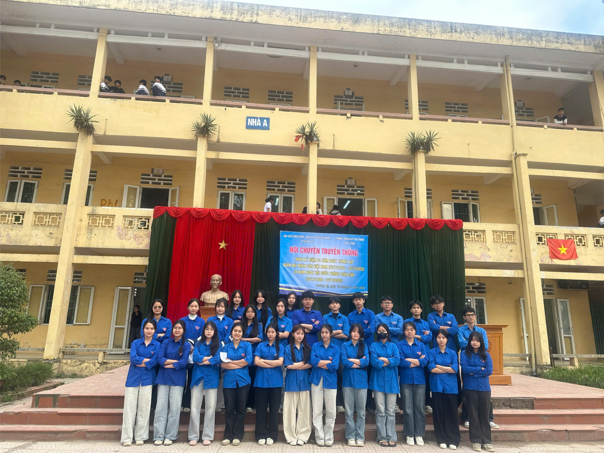 Trong không khí trang nghiêm và đầy ý nghĩa đó, ngày 15/12/2025, Trường THPT Chúc Động vinh dự đón tiếp đồng chí Bùi Bá Dũng – Đảng ủy viên, Phó Chủ tịch Ủy ban MTTQ Việt Nam xã, Chủ tịch Hội Cựu chiến binh xã Quảng Bị và đồng chí Đặng Đình Văn – Phó Bí thư Đoàn TNCS Hồ Chí Minh xã Quảng Bị về nói chuyện truyền thống với cán bộ, giáo viên và học sinh toàn trường.