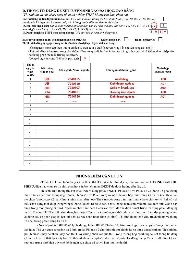 Để ghi thông tin mục này thí sinh cần tìm hiểu kỹ thông tin tuyển sinh của từng trường.