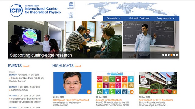 Trang chủ của ICTP công bố GS Phạm Hoàng Hiệp đạt giải thưởng Ramanujan 2019.